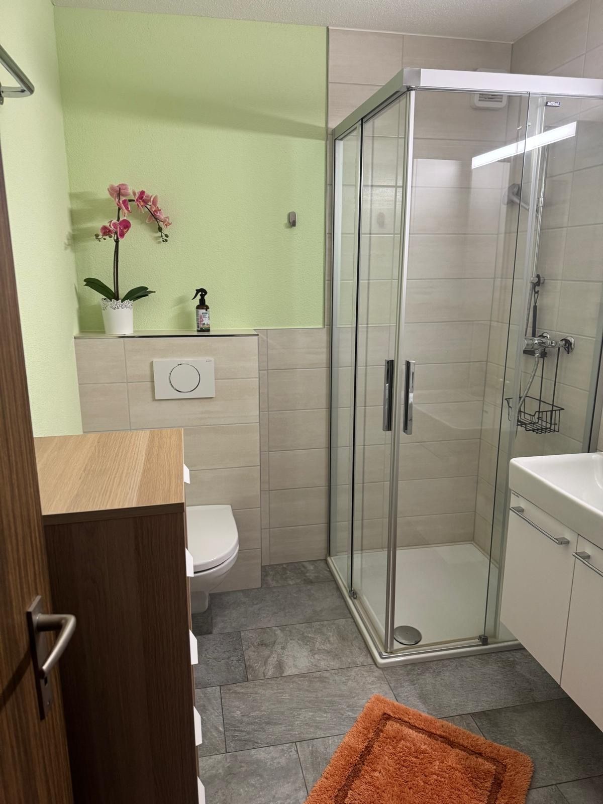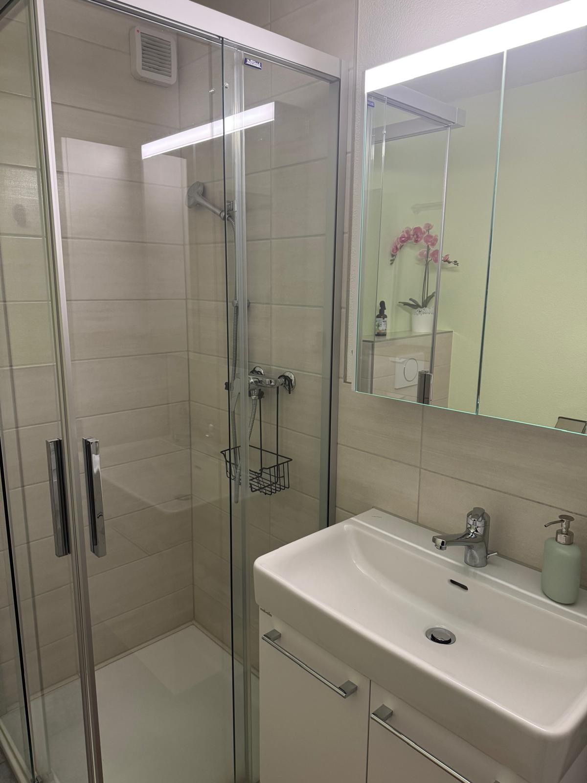 Die Wohnung verfügt über eine modern ausgestattete Küche (inklusive Nespresso-Kaffeemaschine) sowie ein Badezimmer mit Dusche in Eigentumsstandard.