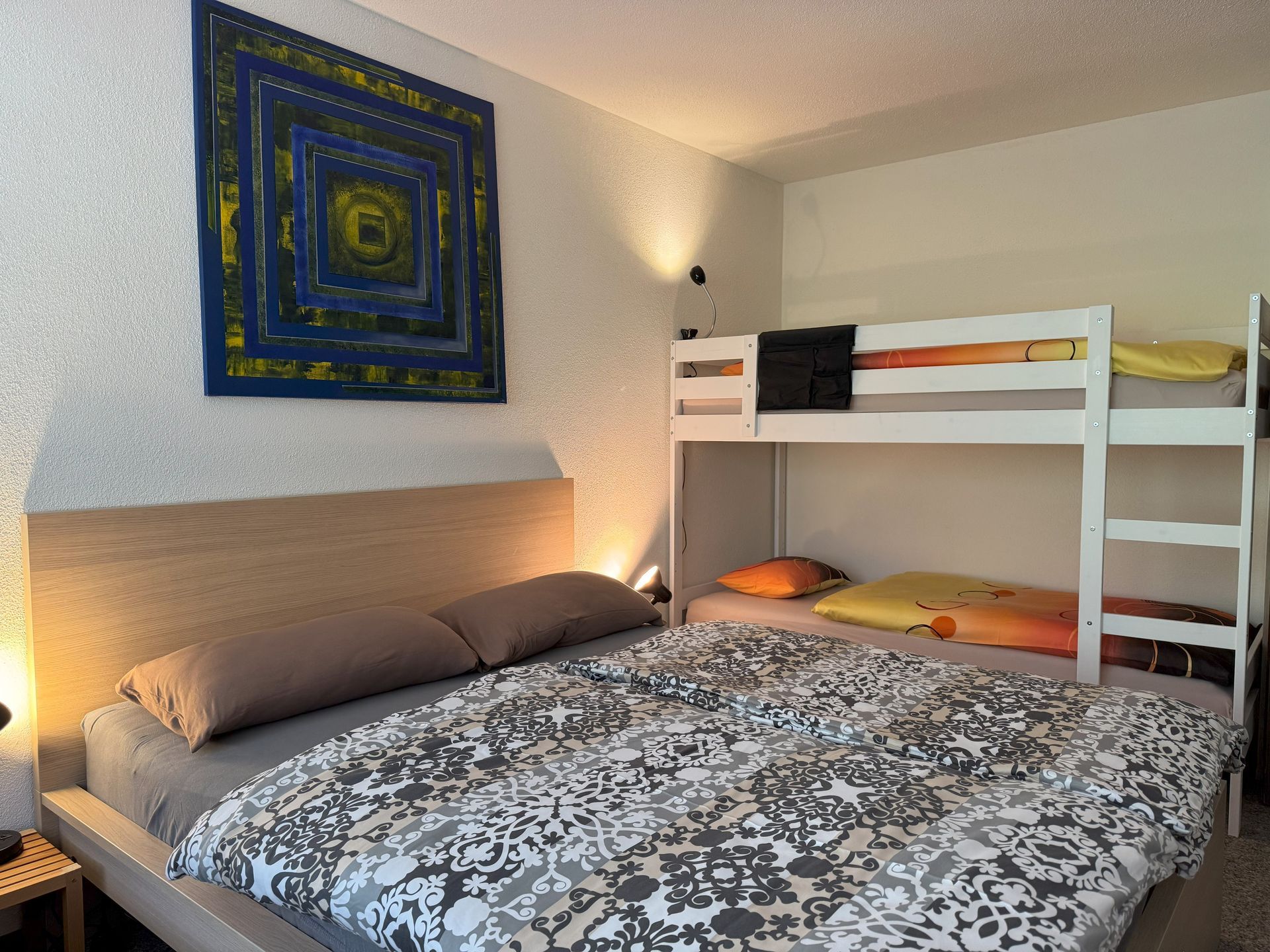Im Schlafzimmer befinden sich ein Doppelbett und ein Etagenbett für insgesamt vier Personen. Ebenfalls hat es im Wohnzimmer ein ausziehbares Sofa.